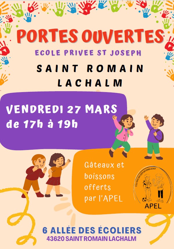 Descendre vers le contenu Saint-Romain-Lachalm, une commune de Haute-LoireAgendaPORTES OUVERTES PORTES OUVERTES Venez découvrir l’école privée St Joseph le 21 mars à partir de 17 h 00